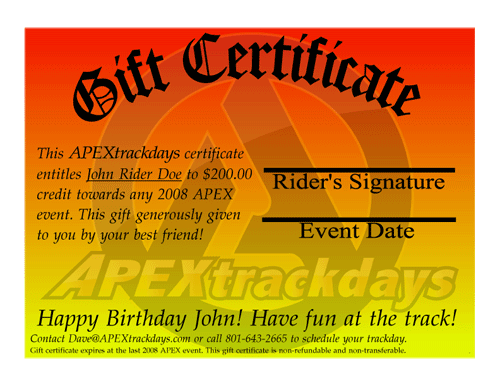Having a hard time finding the perfect gift for your trackday rider? APEX is now offering personalized Trackday Gift Certificates starting at just $50!